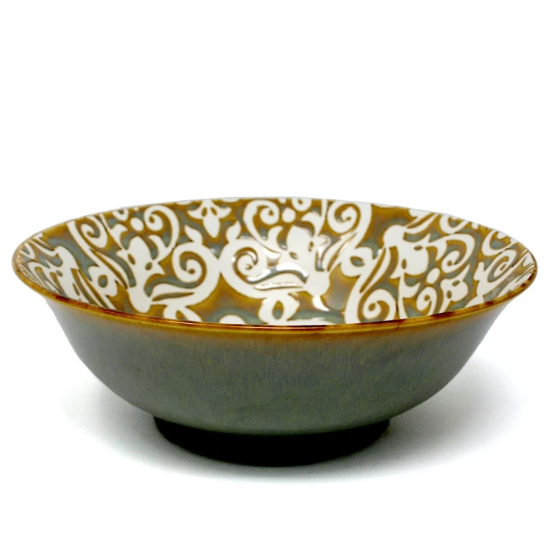 Footed Serving Bowl, 8″ / 20.5cm dia, stoneware. The exterior reactive glaze and damask pattern interior results in distinctive markings, making each piece one-of-a-kind.