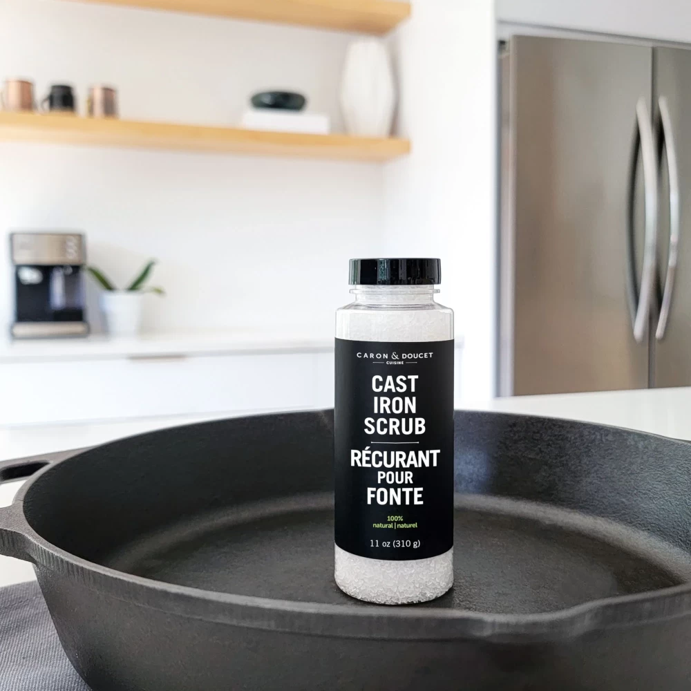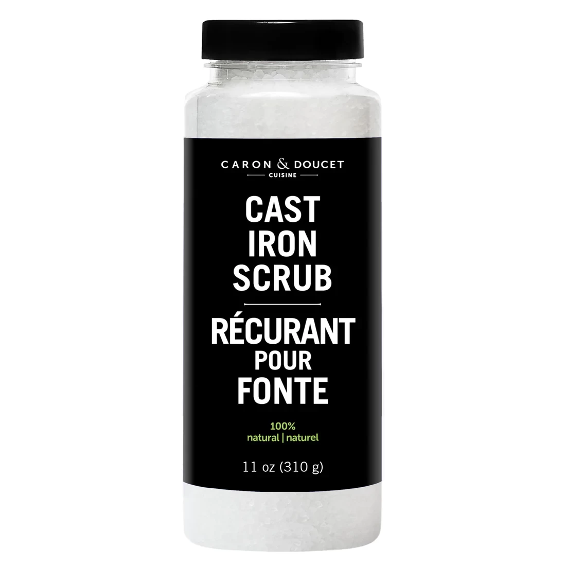 - A light scented scrub made with a proprietary blend of lemongrass and rosemary essential oils that will not transfer onto food or your cast iron’s seasoning.