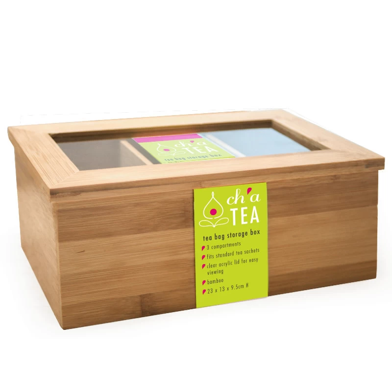 - Tea Bag Storage Box, 9 x 5 x 3.75″ / 23 x 1 3 x 9.5cm, natural bamboo.
