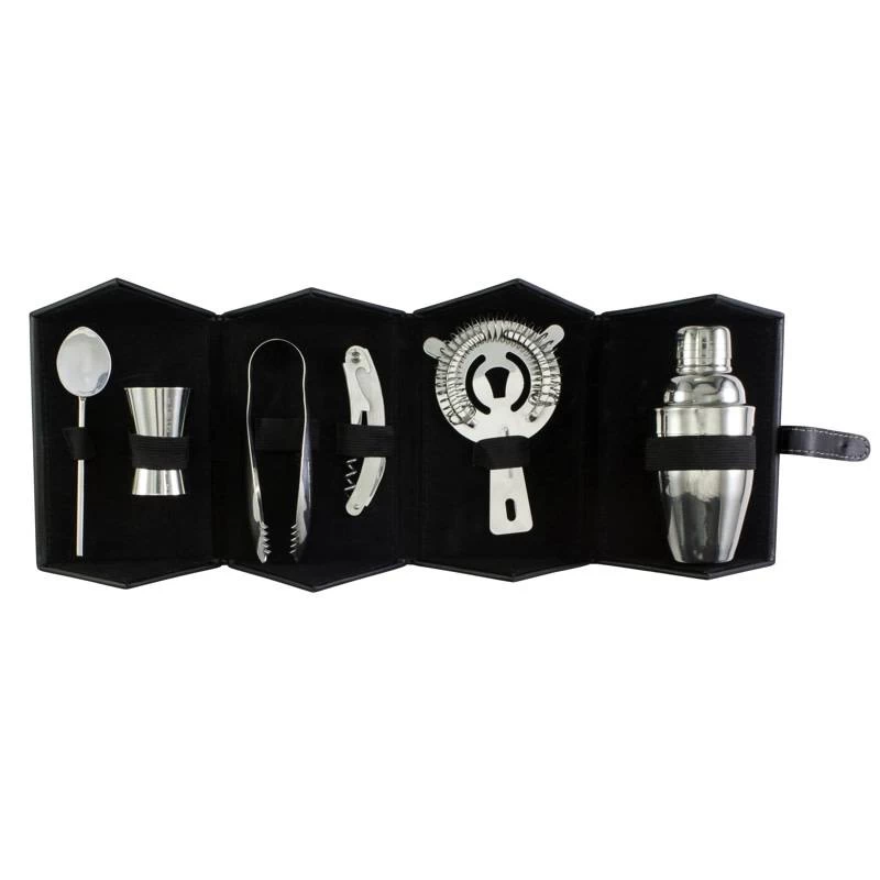 6 piece Bar Accessory Set, with fold-out storage case, stainless steel. Includes a strainer, waiter corkscrew, ice tongs, bar spoon, double jigger and shaker.