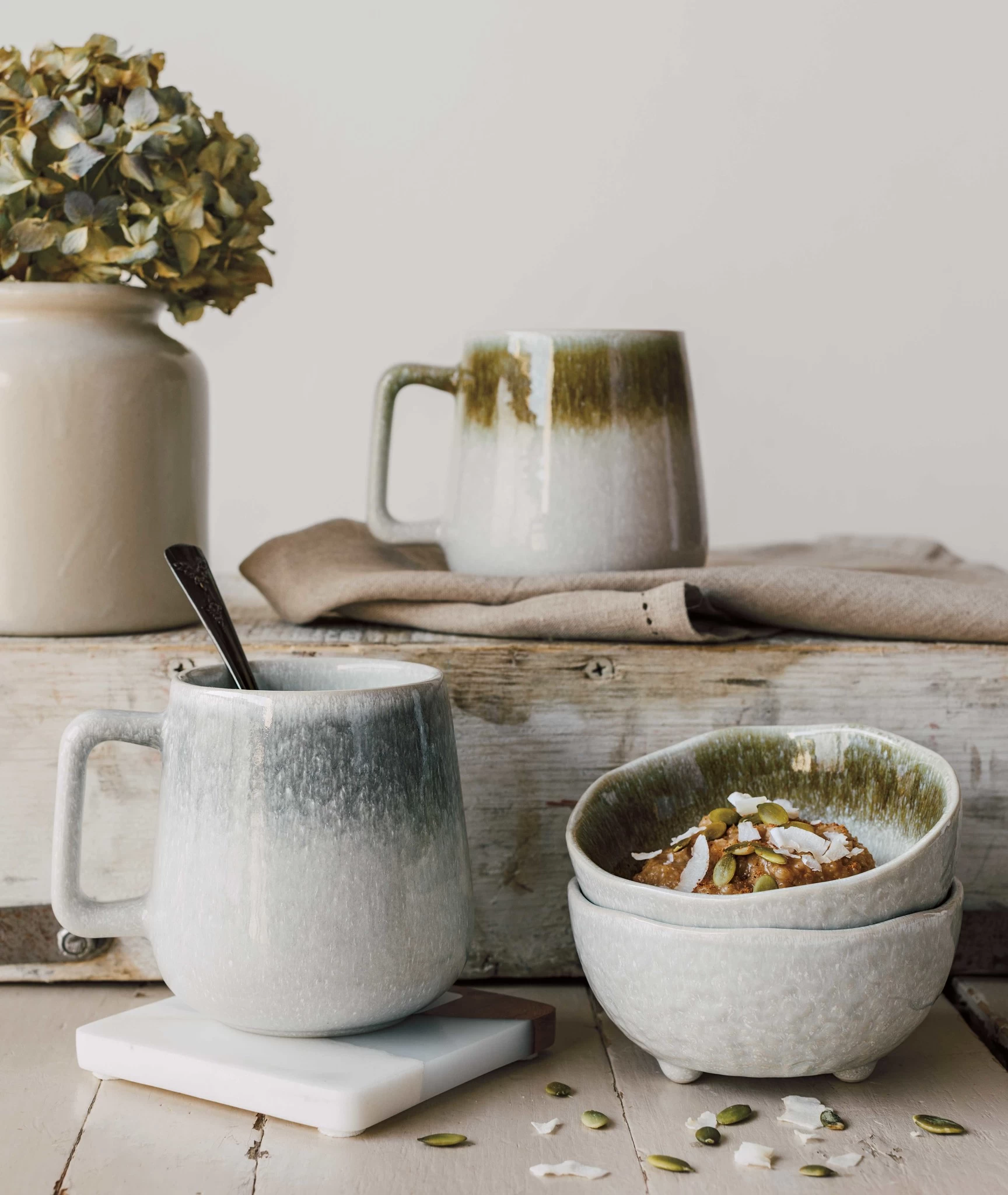 This collection gives rise to peaceful moments throughout your day. Sip your coffee from a smooth-glazed mug as you take in the mist over the water, or the dew in your backyard.