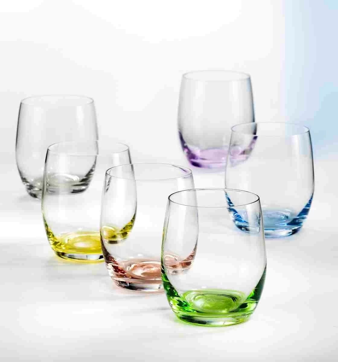 Assorted coloured stemless glasses. Ideal for wine, water, juice or cocktails.