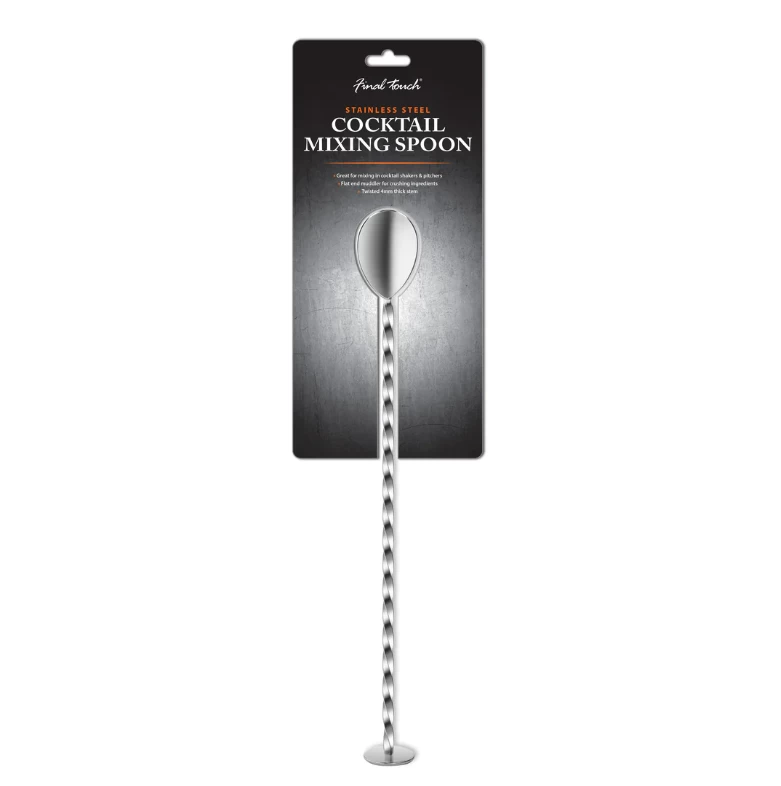 This cocktail mixing spoon is commonly used by bartenders for mixing and layering cocktails. The long twisted 4mm thick stem can be used to layer drinks and also features a flat end for crushing ingredients.