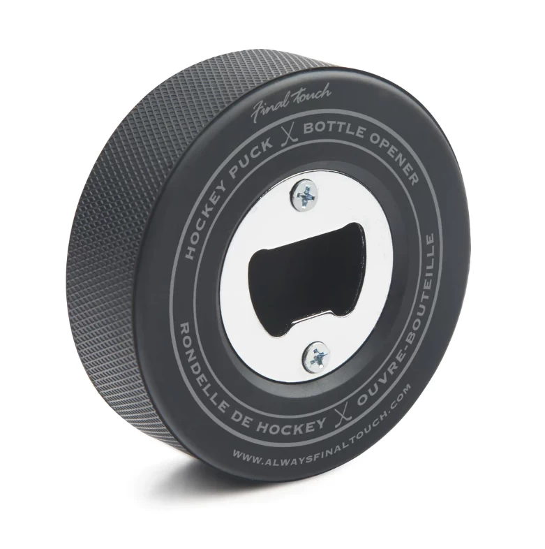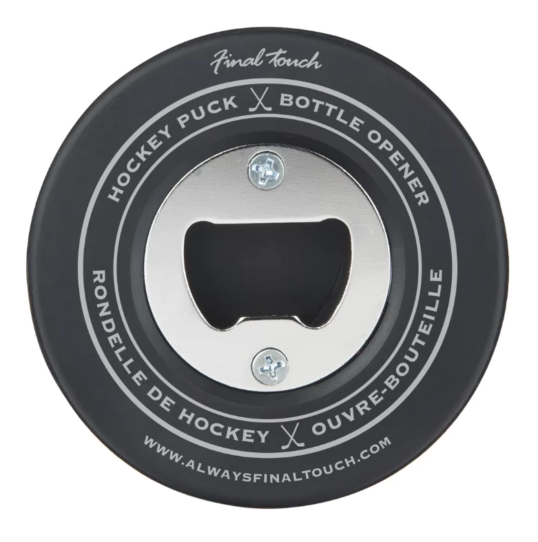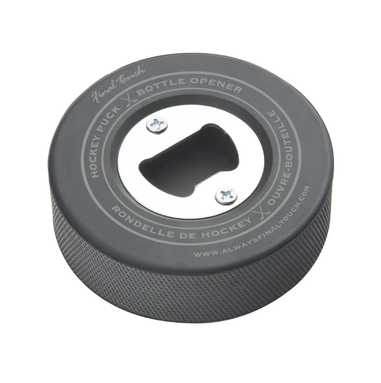 Made from real hockey pucks! Pop open your favourite drink before the game with this opener made from a rubber hockey puck! The puck opener fits comfortably in your hand to remove stubborn caps with ease because it is the actual, playable size.