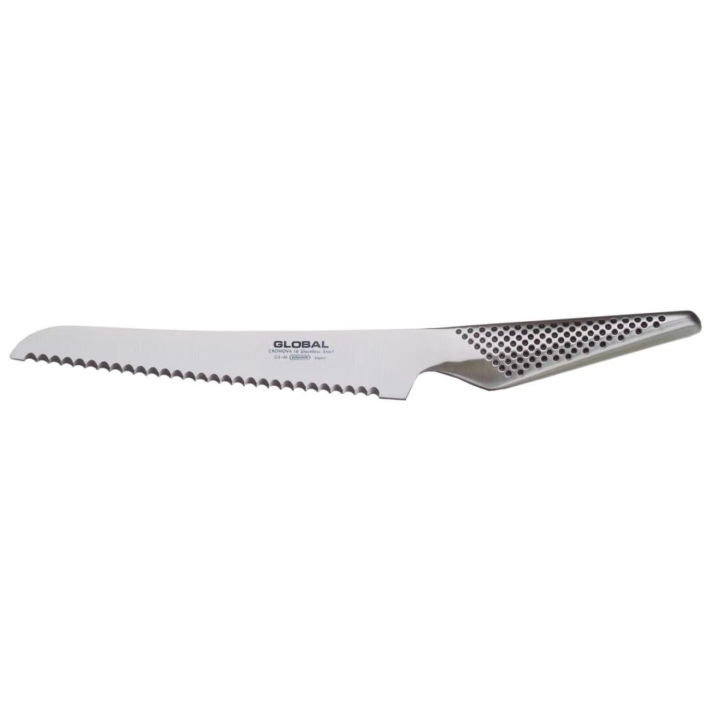 GLOBAL knives are made from the finest stainless steel material. The blades utilize CROMOVA 18 high-carbon stainless steel, ice tempered and hardened to Rockwell C56°-58° which holds a razor sharp edge longer than any other steel and resists rust, stains and corrosion. Smooth contours and seamless construction eliminate food and dirt traps, offering the ultimate in safety and hygiene. Stainless-steel hollow handles are perfectly balanced to offset the weight of each blade and textured, providing an excellentgrip and balance in the hand. Edges extend 1/4” up the blade and are gound to a straight point, rather than beveled, to provide a dramatically sharper blade that keeps its edge longer. Iconic dots on the knife’s handle represent the seven virtues of Bushido from the traditional Japanese Samurai code of honour. The oval angled flute pattern is exclusive to Global. While other knife manufacturers get their knives fluted from factories using the same machine, producing a circular shape in the middle of the knife, YOSHIKIN invested in machinery to create an oval angled flute pattern easily distinguishable from others. The new flute allows food to easily release from the knife as the pattern is now angled parallel to the blade. The new flute pattern is available for the G and GS series knives.