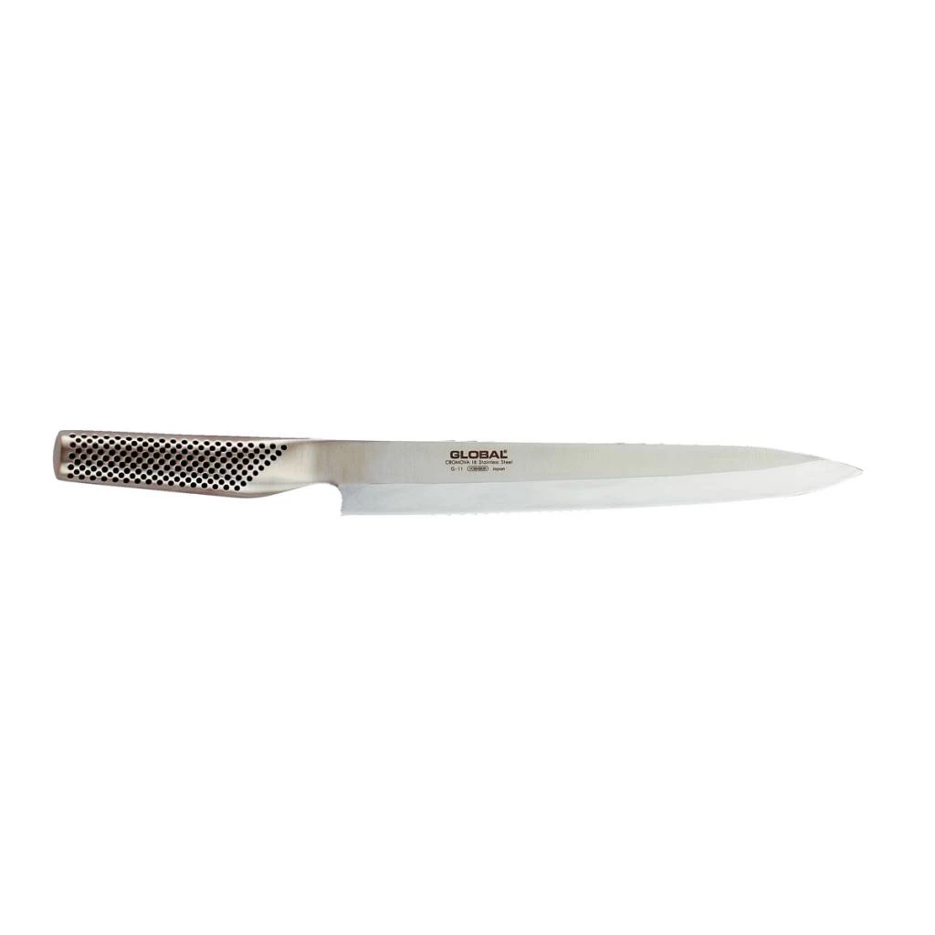 GLOBAL knives are made from the finest stainless steel material. The blades utilize CROMOVA 18 high-carbon stainless steel, ice tempered and hardened to Rockwell C56°-58° which holds a razor sharp edge longer than any other steel and resists rust, stains and corrosion. Smooth contours and seamless construction eliminate food and dirt traps, offering the ultimate in safety and hygiene. Stainless-steel hollow handles are perfectly balanced to offset the weight of each blade and textured, providing an excellentgrip and balance in the hand. Edges extend 1/4” up the blade and are gound to a straight point, rather than beveled, to provide a dramatically sharper blade that keeps its edge longer. Iconic dots on the knife’s handle represent the seven virtues of Bushido from the traditional Japanese Samurai code of honour. The oval angled flute pattern is exclusive to Global. While other knife manufacturers get their knives fluted from factories using the same machine, producing a circular shape in the middle of the knife, YOSHIKIN invested in machinery to create an oval angled flute pattern easily distinguishable from others. The new flute allows food to easily release from the knife as the pattern is now angled parallel to the blade. The new flute pattern is available for the G and GS series knives.