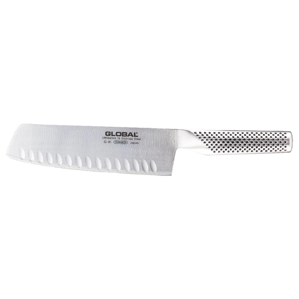 GLOBAL knives are made from the finest stainless steel material. The blades utilize CROMOVA 18 high-carbon stainless steel, ice tempered and hardened to Rockwell C56°-58° which holds a razor sharp edge longer than any other steel and resists rust, stains and corrosion. Smooth contours and seamless construction eliminate food and dirt traps, offering the ultimate in safety and hygiene. Stainless-steel hollow handles are perfectly balanced to offset the weight of each blade and textured, providing an excellentgrip and balance in the hand. Edges extend 1/4” up the blade and are gound to a straight point, rather than beveled, to provide a dramatically sharper blade that keeps its edge longer. Iconic dots on the knife’s handle represent the seven virtues of Bushido from the traditional Japanese Samurai code of honour. The oval angled flute pattern is exclusive to Global. While other knife manufacturers get their knives fluted from factories using the same machine, producing a circular shape in the middle of the knife, YOSHIKIN invested in machinery to create an oval angled flute pattern easily distinguishable from others. The new flute allows food to easily release from the knife as the pattern is now angled parallel to the blade. The new flute pattern is available for the G and GS series knives.