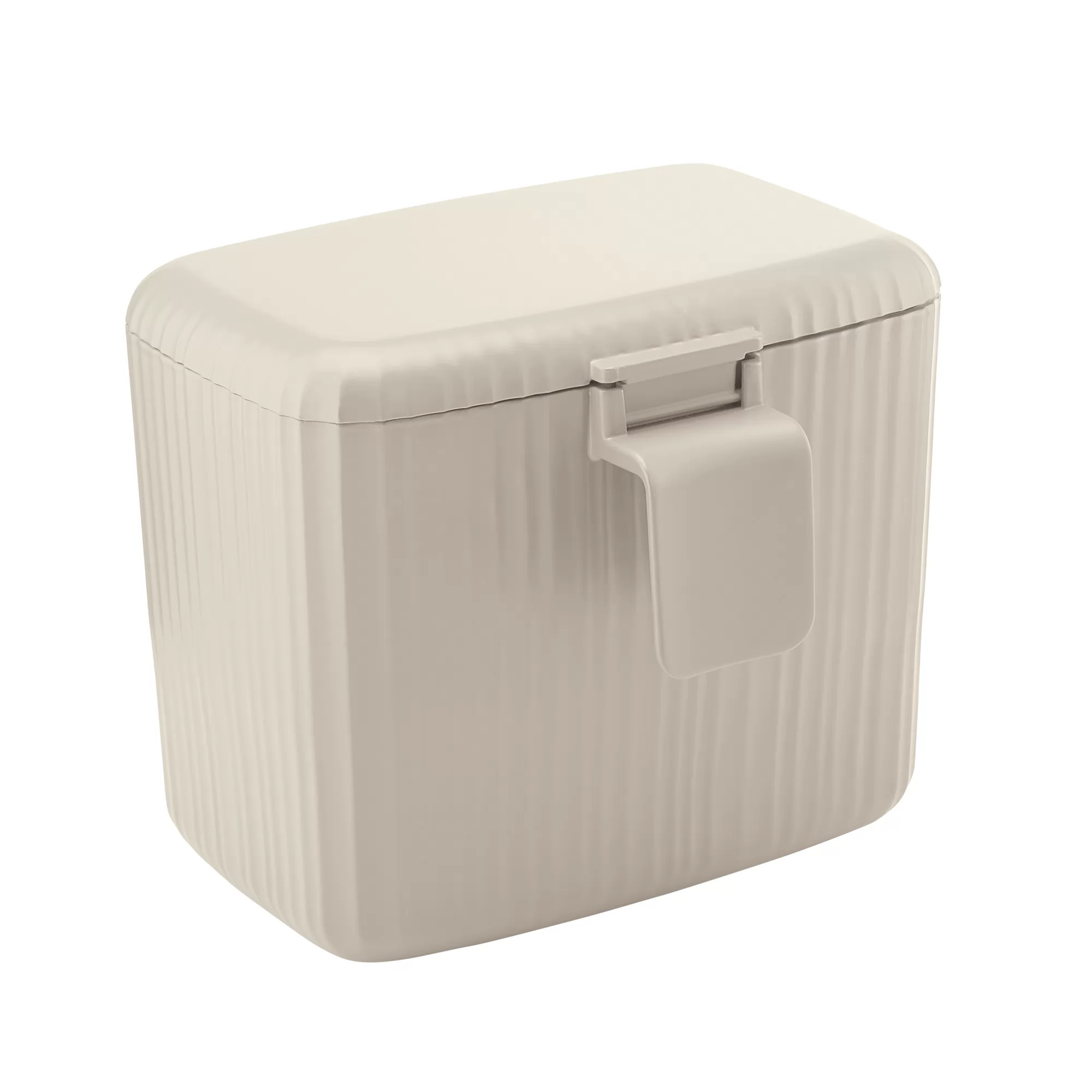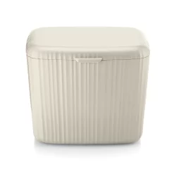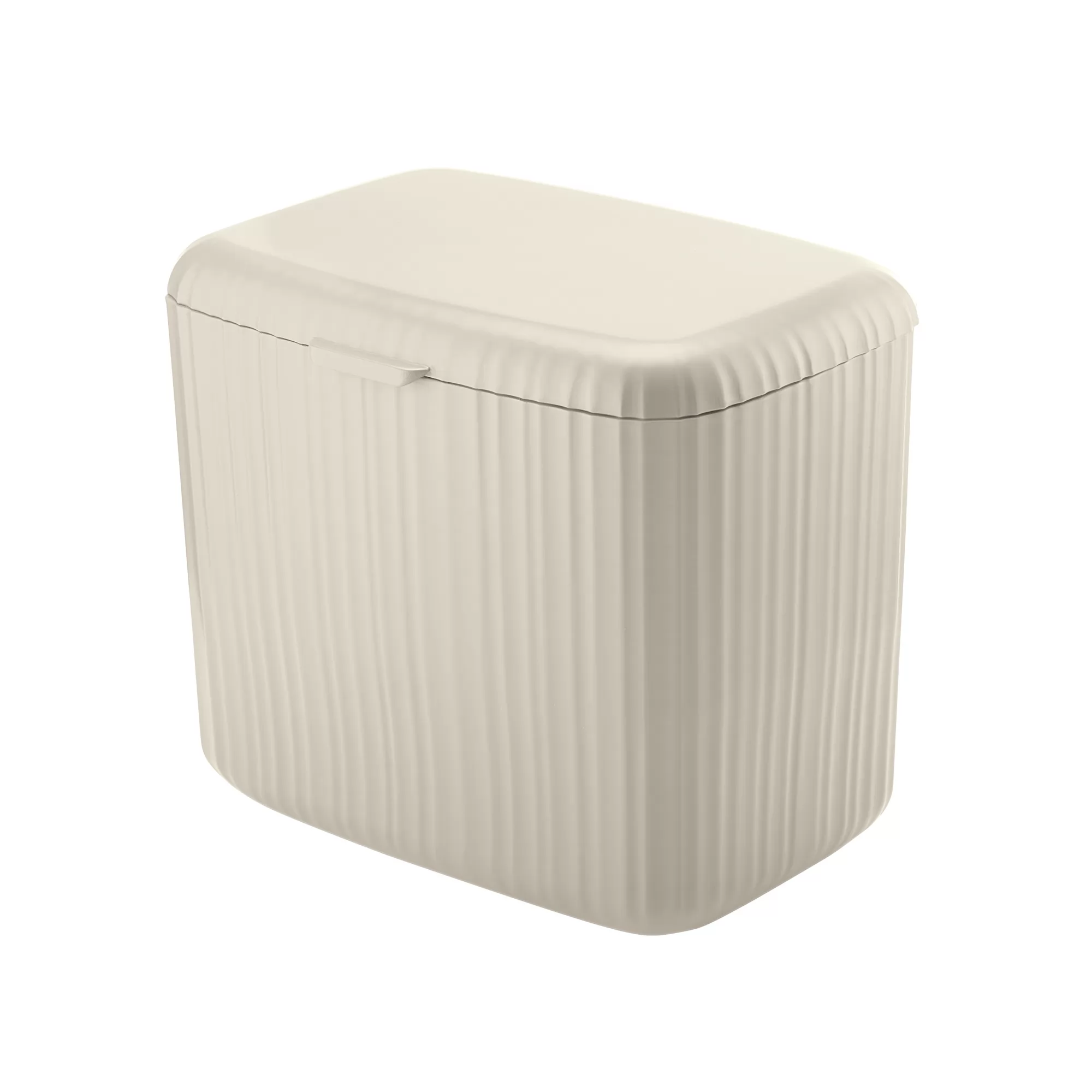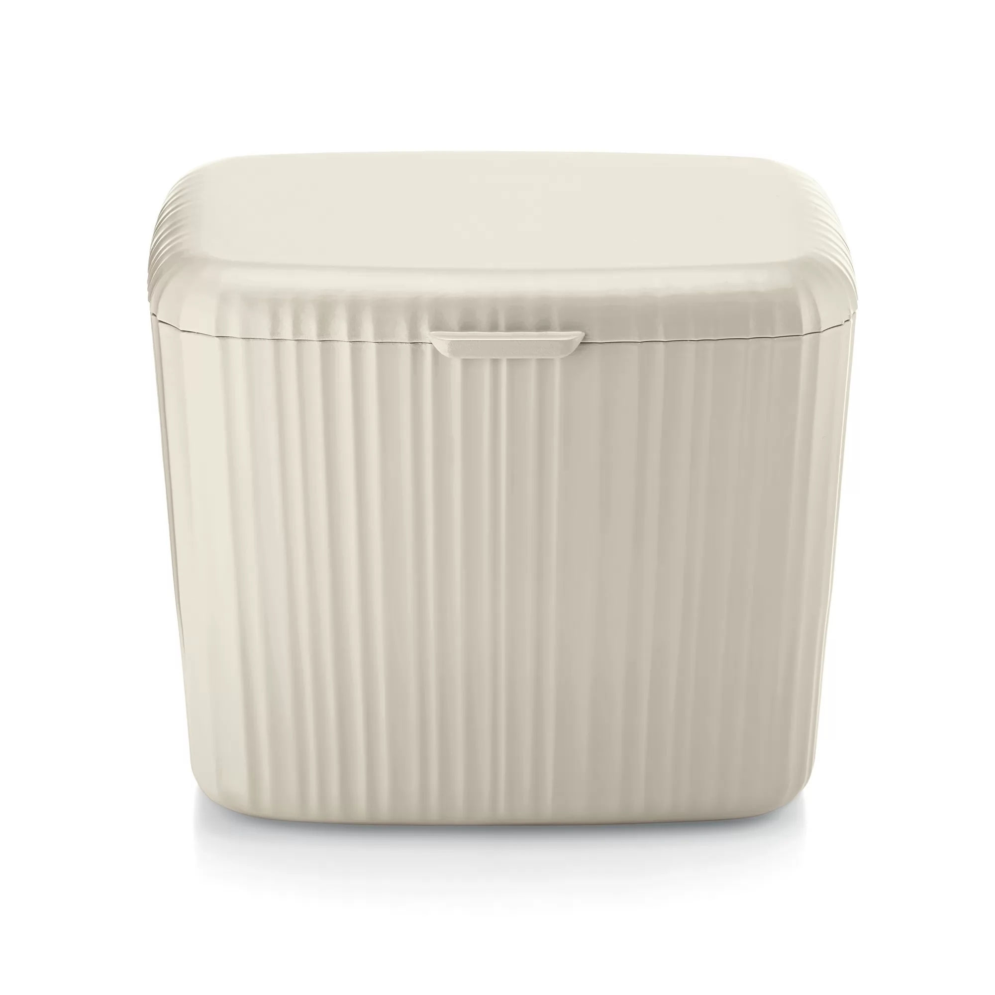 Food waste caddy, a container with lid to collect the organic and compostable waste produced during cooking, made from antibacterial plastic which reduces bacteria proliferation, by recycling 4.6 100% post-consumer disposable plastic detergent bottles. The food waste caddy has a completely removable lid that can be opened and closed with just one hand, and which can be kept vertical when in use to receive waste more easily. There is also a handy hook on the back for easy portability or for hanging the waste bin on a kitchen drawer or cabinet. Hand washable, it is really an excellent aid for people who like to keep their worktop clean while cooking.