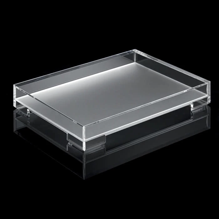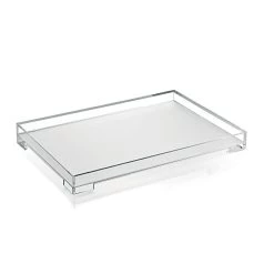 Simple tray with raised edges for safer carrying of contents, also perfectly stackable to ensure space-saving. The type of plastic used is crystal-clear and the satin-finish base is scratch-proof.