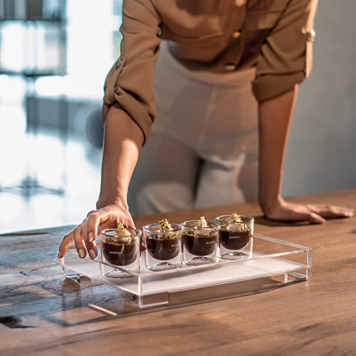 Simple tray with raised edges for safer carrying of contents, also perfectly stackable to ensure space-saving. The type of plastic used is crystal-clear and the satin-finish base is scratch-proof. Easy grip for the safest serving.
