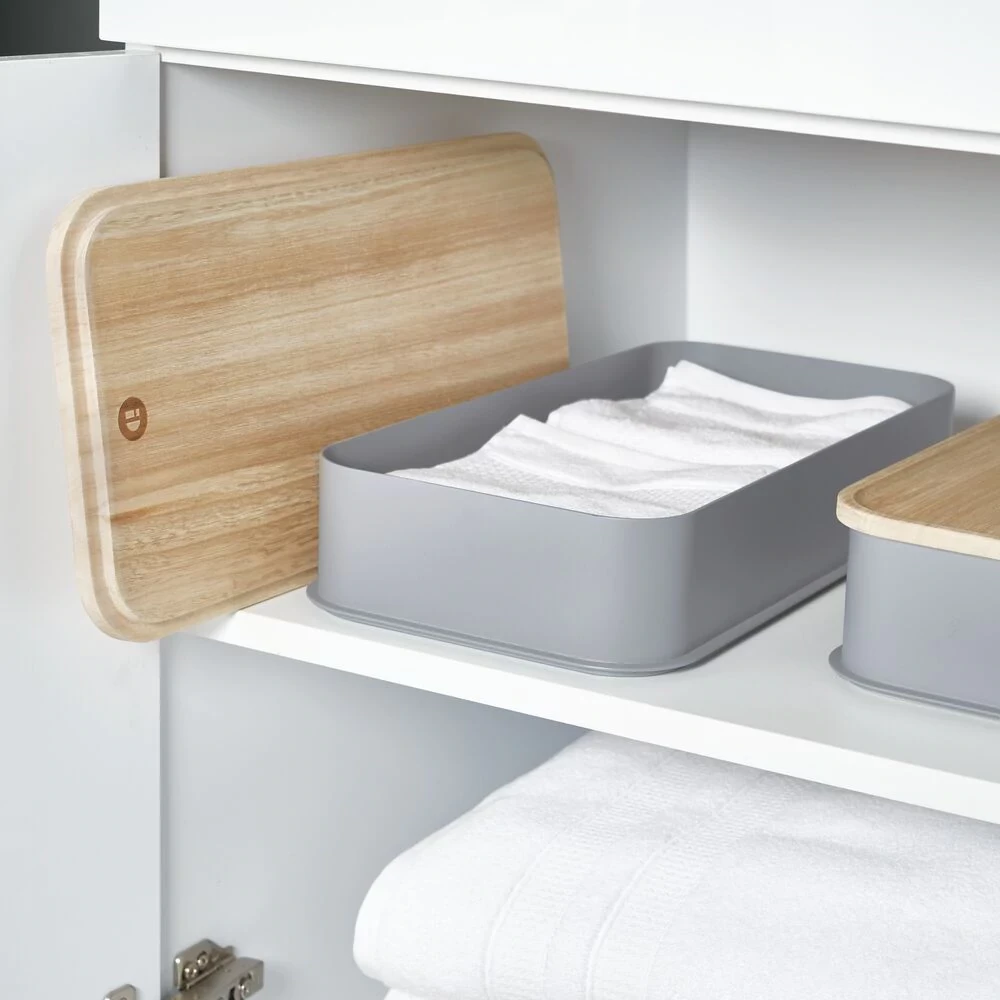Sustainability meets storage with the iDesign Eco Recycled Plastic Medium Bin with Paulownia Wood Lid. This eco-friendly bin provides storage in the bathroom for items such as makeup, skincare, soaps, lotions, hair and body care products, and more. The coordinating lid keeps items in place and provides additional catch-all storage on top of the bin. This versatile lidded storage container is also great for use in the bedroom, closet, kitchen, pantry, office, craft room, nursery, and more.