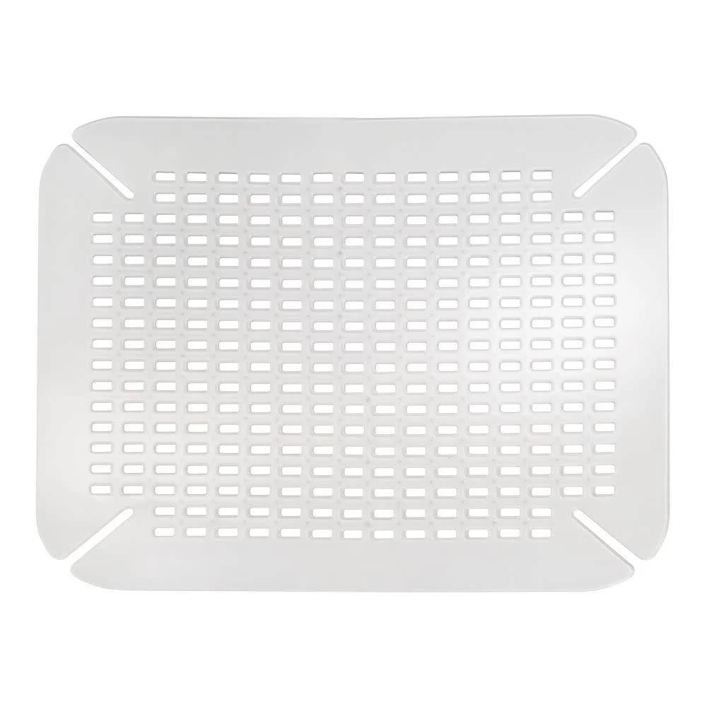 Open grid pattern allows water drainage. Corners curve up to fit in small sinks, lays flat in large sinks.