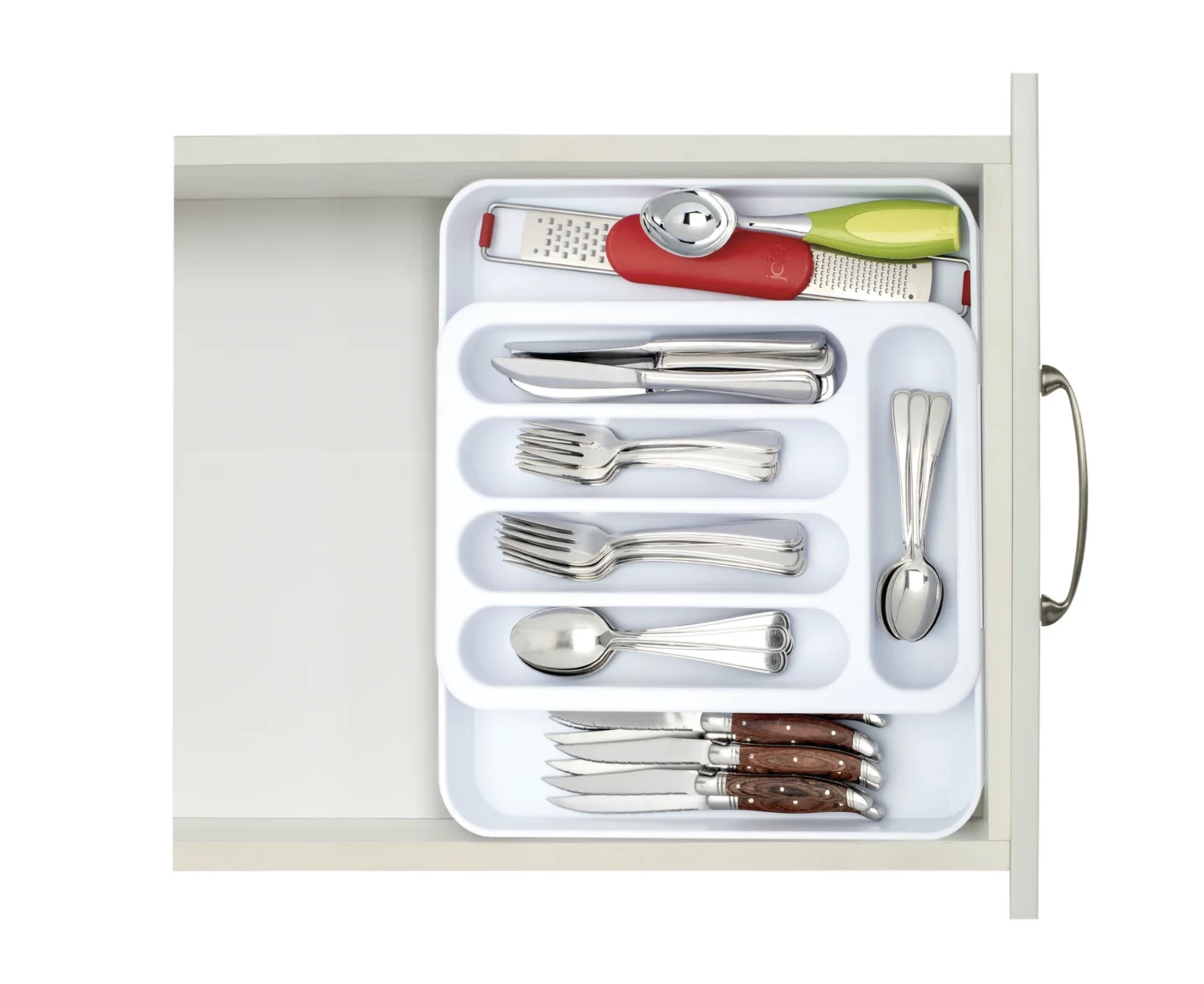 Practical convenience to neatly organize your cutlery drawer. Fits drawers sizes between 9.84 in -16.14 in.