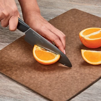 The Revolution 5.5″ Santoku is a traditional Japanese shape with a straight cutting edge and rounded shoulder and curved handle to provide control during slicing, dicing or mincing fruits, vegetables and boneless meats. Our most popular knife, it features