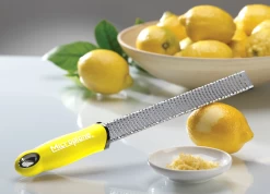 This tool grates even the hardest Parmesan Reggiano as well as other hard cheeses into fine lacy wisps. Ideal for topping your favorite spaghetti and meatballs or a Caesar salad. It’s also wonderful for effortless citrus zesting.