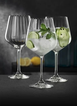 On the table and while serving the popular cult drink, the Gin & Tonic glasses are an eye-catcher. In the hand, the crystal glasses invite to swirl and enjoy.