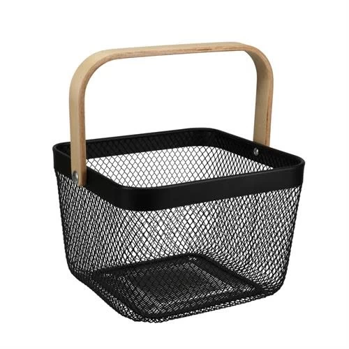 Market Basket, with bamboo handle, 25cm square, black wire mesh.