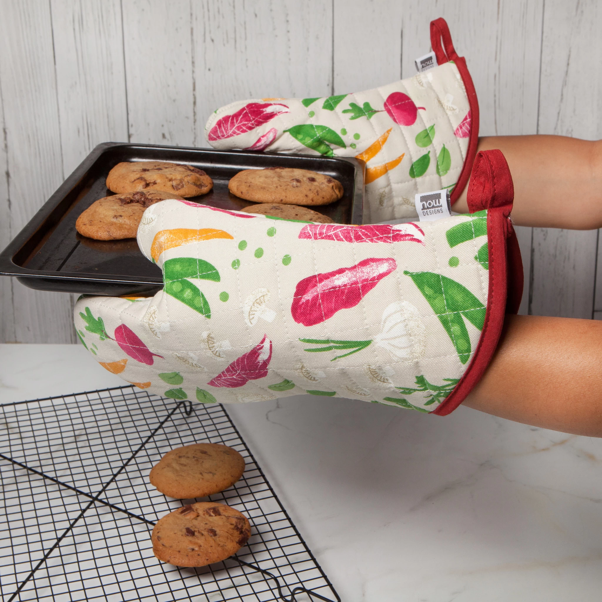 Every kitchen needs a great pair of oven mitts. Made from 100% cotton and lined with silver acrylic coated cotton, each mitt is 13-inches long and measures 6.5-inch from thumb to exterior side. The quilted construction with insulation also helps to protect your hands from the heat.