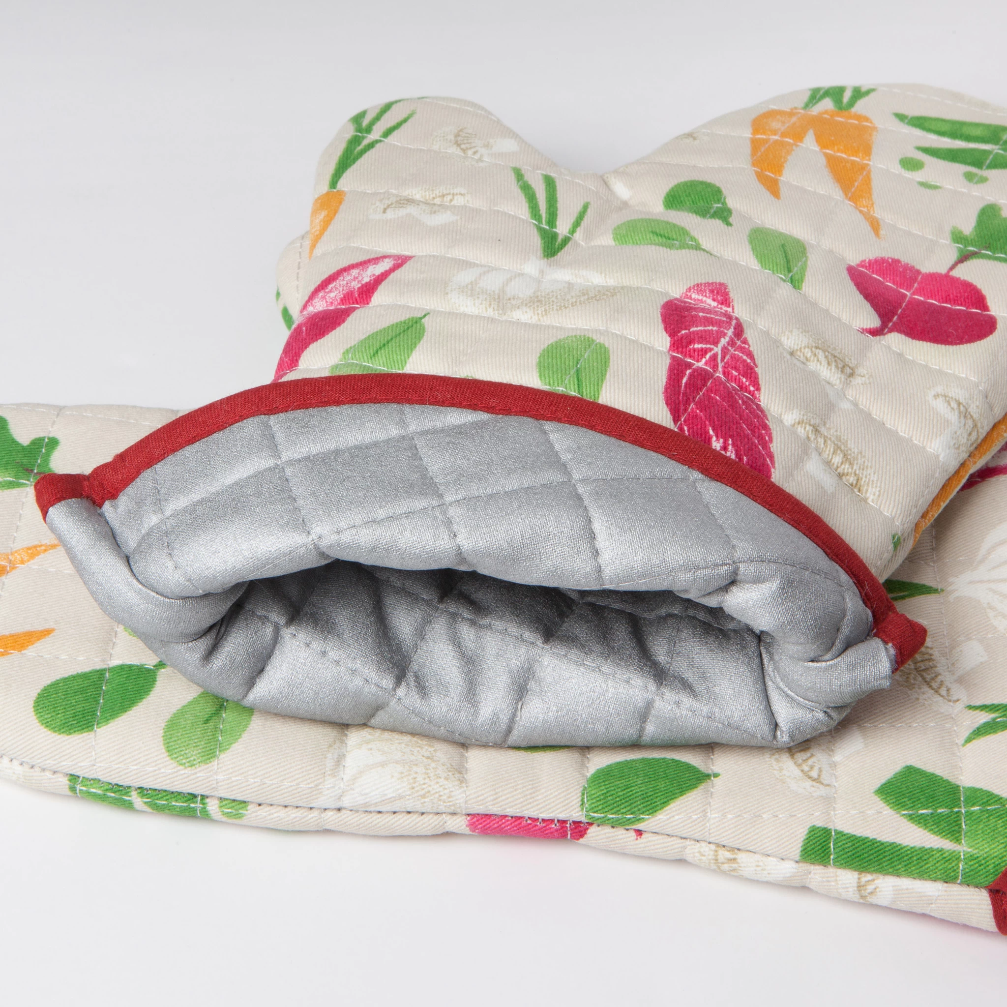 Made from 100% cotton and lined with silver acrylic coated cotton, each mitt is 13-inches long and measures 6.5-inch from thumb to exterior side. The quilted construction with insulation also helps to protect your hands from the heat.
