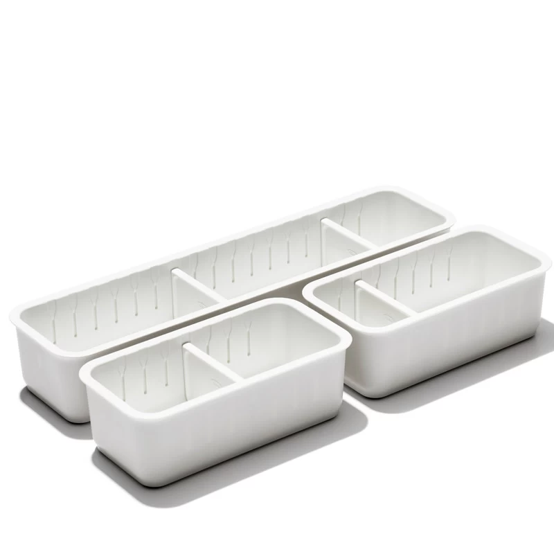 - Designed with movable dividers that slide and snap into channels to separate items for space-efficient organization in cabinets or drawers.