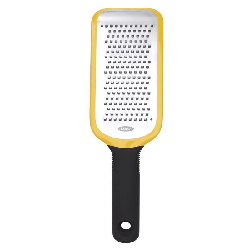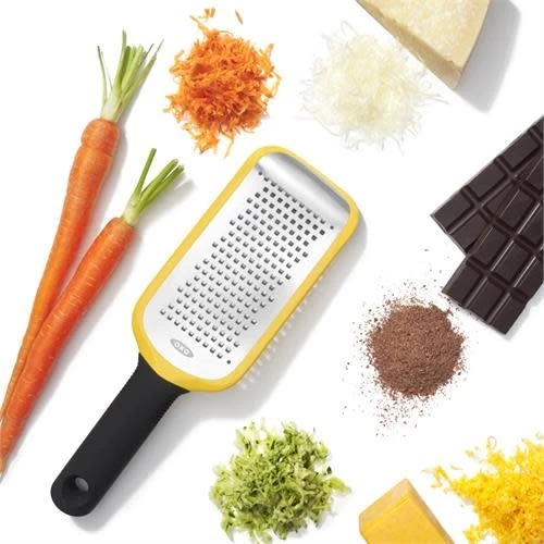 Etched Medium Grater, stainless steel. Perfect for grating hard cheeses, zucchini, carrots and coconut. Sharp, etched stainless-steel blade. Includes a protective cover for safe storage.