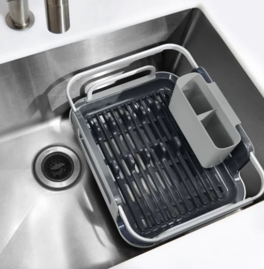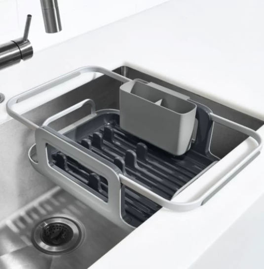 - Extendable arms adjust to fit different sink sizes or retract for compact storage