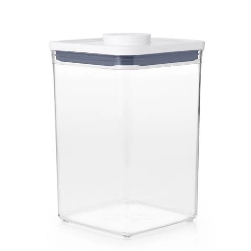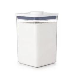 Big Square Medium Container, 4.2L. Ideal size for a 5lb bag of flour or sugar. Get an airtight seal with the press of a button. Accessories attachment on base of each lid allows to store scoops, levelers and more. Containers are stackable for optimal countertop and pantry organization. Container corners allow for easy pouring. Pop-up button serves as handle to lift off lid.