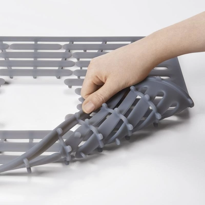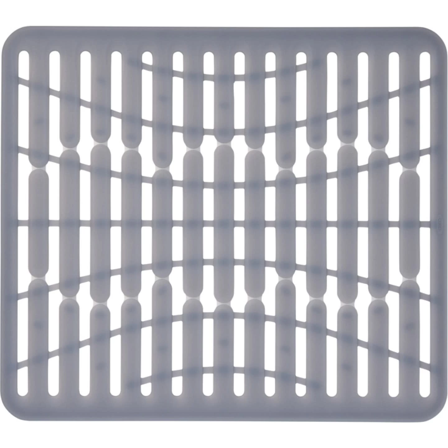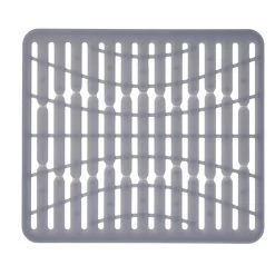 Sink Mat, small, 11.25 X 12.75″ / 28.5 x 32cm, grey, silicone, PVC free. The soft silicone provides a cushion to protect sink, glasses and dishes from scratching and chipping. Elevated underneath to allow for water flow and aeration. Designed with a convenient pattern that allows you to cu t a hole exactly where you need it, whether your sink drain is in the center or offset . The silicone is heat-safe, making it safe to place pots and pans in the sink directl y from the stove. Dishwasher safe.