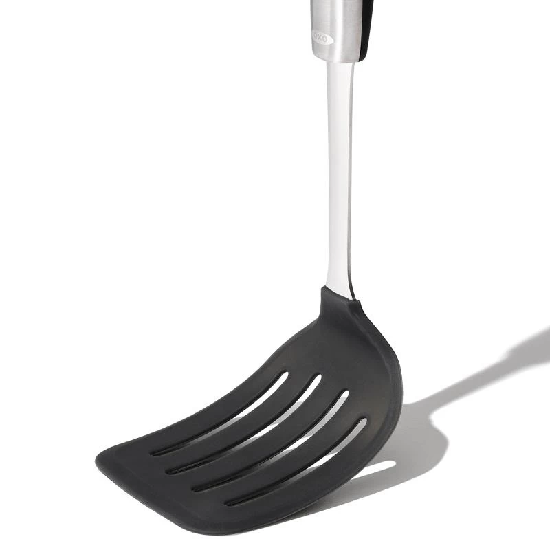 - Features the strength and durability of a stainless steel turner but with a heat-safe silicone head for a non-scratch performance.