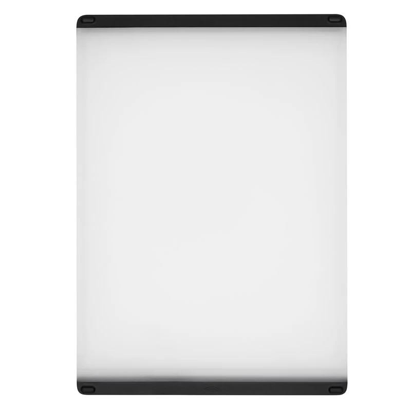 Utility Cutting Board, 27 x 38cm, white, polypropylene, BPA free. Durable, non-porous, odor resisting polypropylene surface. Soft, tapered grips for easy lifting. Double-sided to help prevent cross-contamination. Resists deep scratches and maintains sharp knives. Juice groove retains liquids.