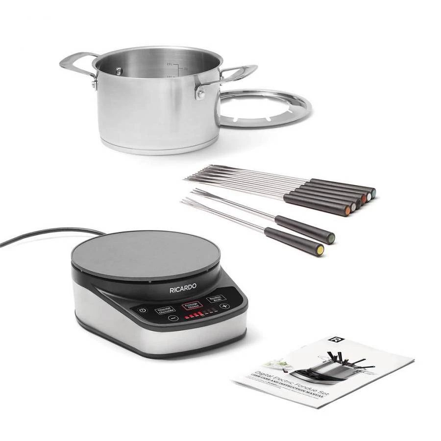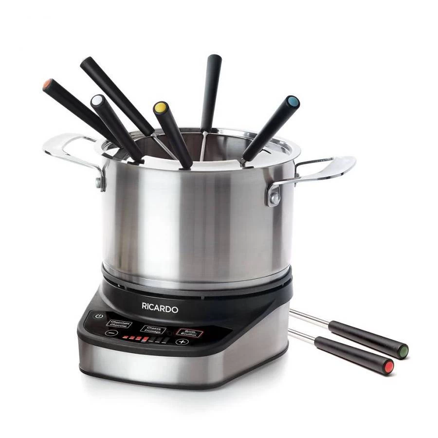 Make every fondue night a savoury success with this RICARDO electric fondue set. Thanks to pre-programmed settings, it offers precise temperature control of broths, cheese fondues and chocolate fondues throughout the meal. Both practical and safe, the set includes eight differently coloured forks and an elegant, contemporary-styled chrome stand.