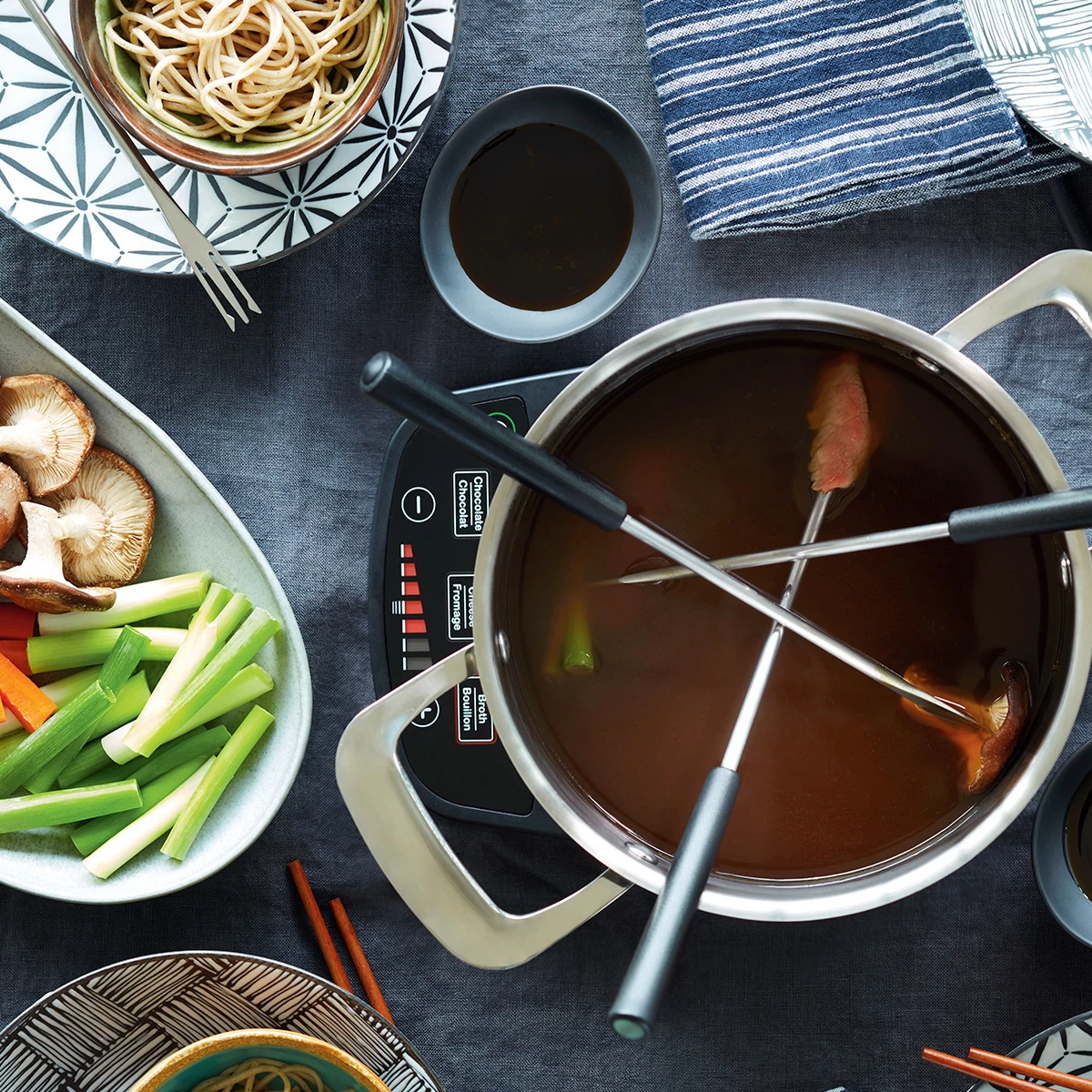 Make every fondue night a savoury success with this RICARDO electric fondue set. Thanks to pre-programmed settings, it offers precise temperature control of broths, cheese fondues and chocolate fondues throughout the meal.