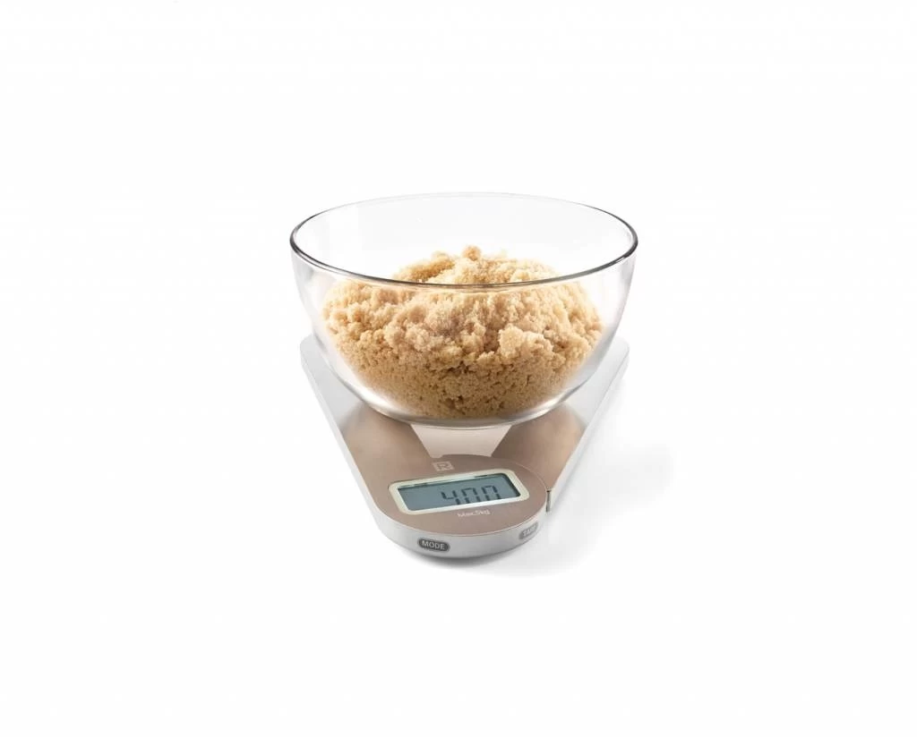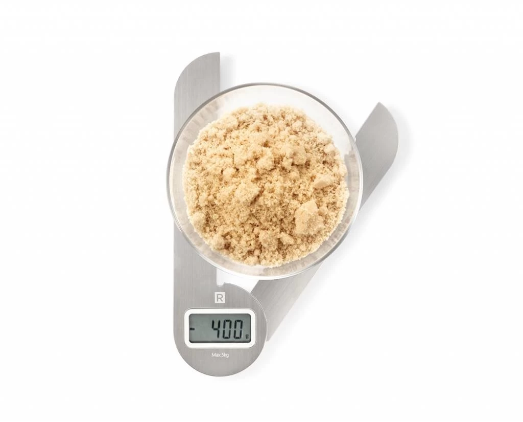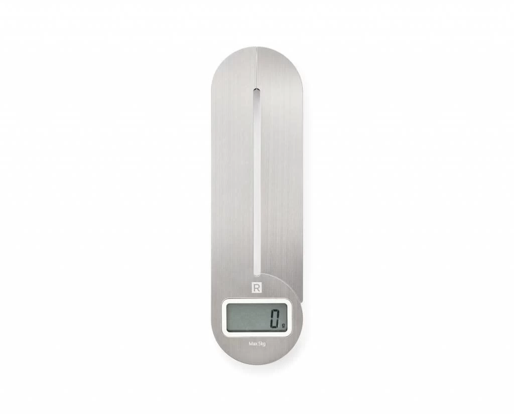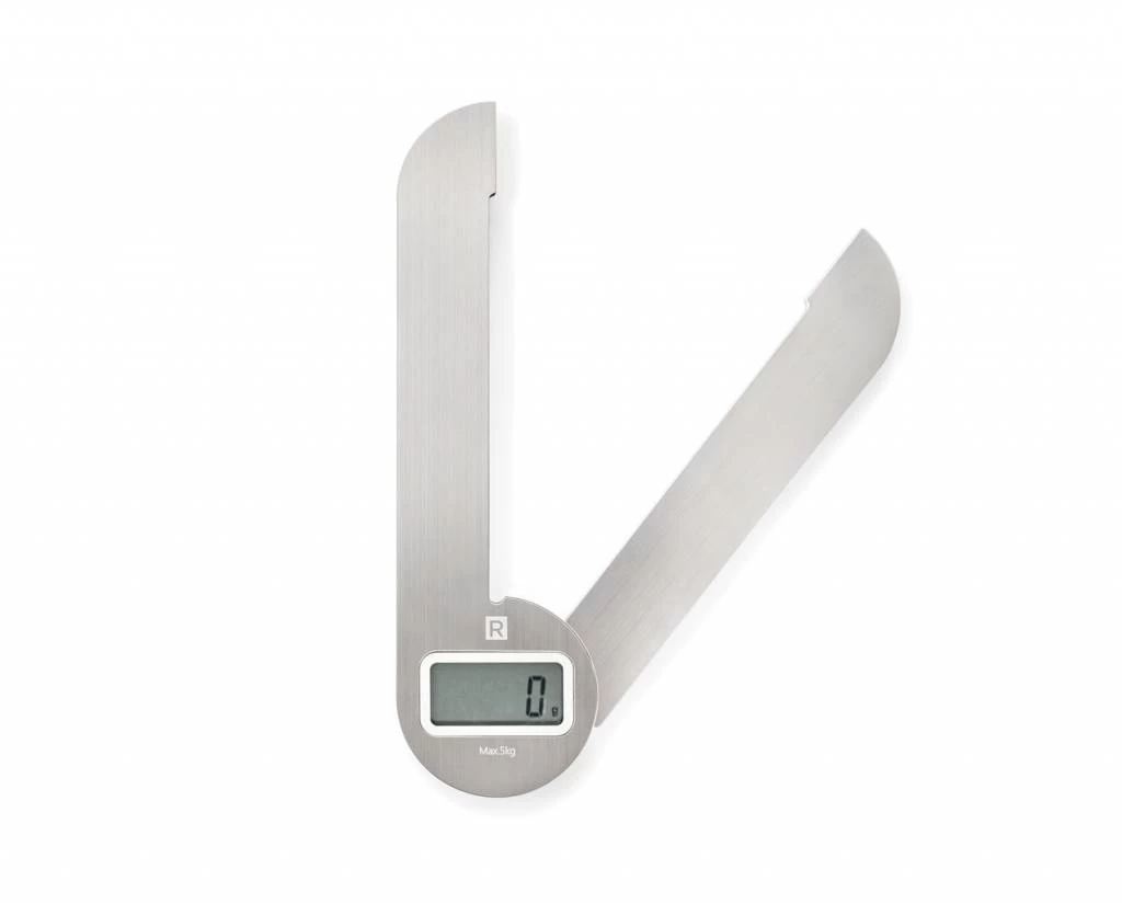 This kitchen scale was designed for weighing with precision ingredients such as flour and sugar. The scale can be opened to widen the weighing surface and folded again for easy storage.