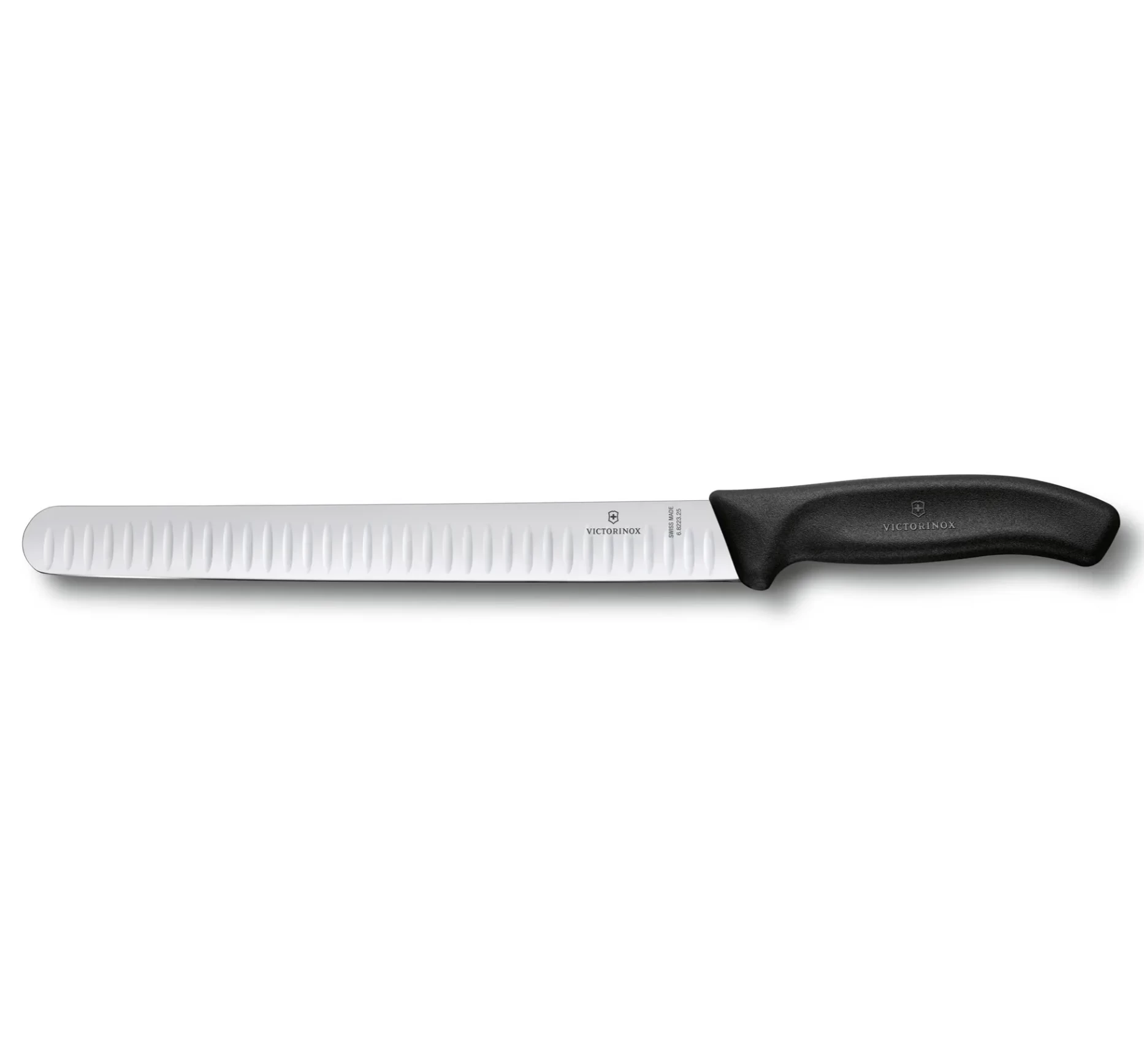 Slice the perfect cut for your family, your guests and yourself. No matter what you’re serving, the Swiss Classic Slicing Knife makes easy work of juicy roastbeef and tricky turkeys alike. Its ergonomic handle fits perfectly into your hand and the fluted edge makes sure every meat glides effortlessly off the blade. In short: bon appetit!